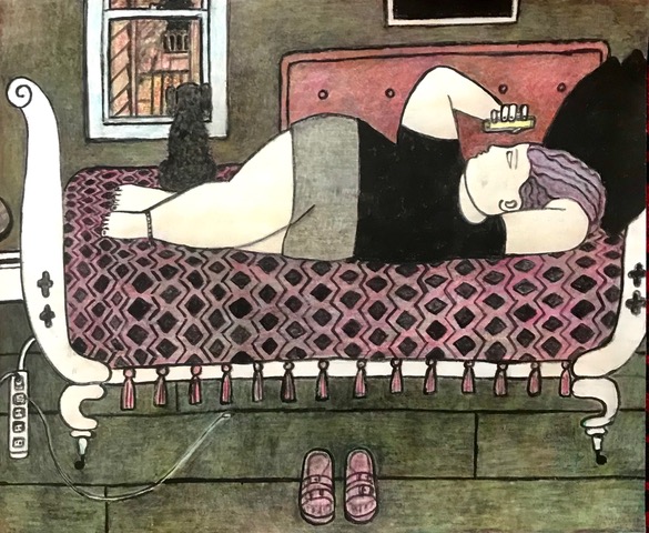 Image: Nora Riggs, Girl with phone, 2020, Ink, graphite and crayon. 14 × 17 in