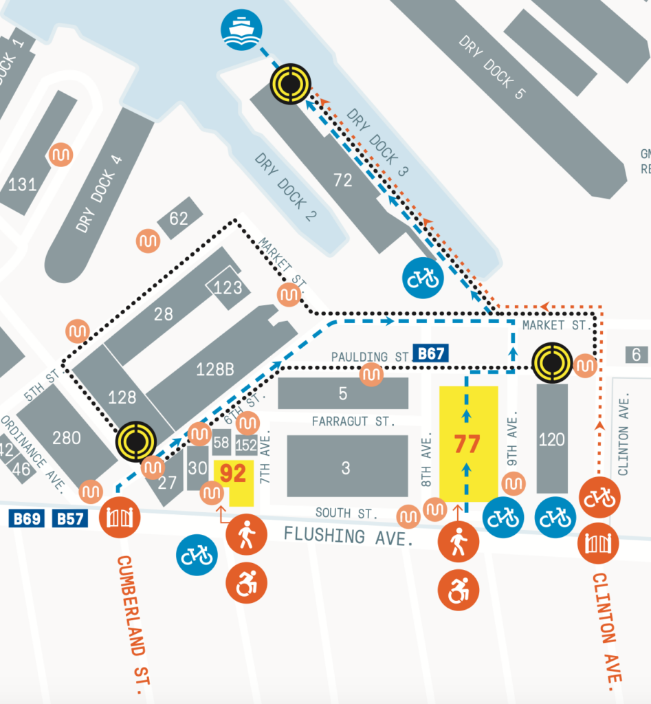 By NYC Ferry: The Brooklyn Navy Yard stop is a 10-15 minute ride on the Astoria line, either from Wall Street (take the northbound/90th Street-bound ferry 1 stop to the Brooklyn Navy Yard) or from East 34th Street (take the southbound/Wall Street-bound ferry 1 stop to the Brooklyn Navy Yard). Dieu Donné, in Building 3 at the Navy Yard, is a 12-minute walk from the ferry stop (see map below).