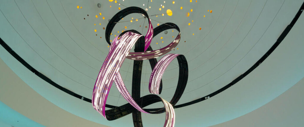 Daniel Canogar, Dynamo [detail], Spanish Pavilion at Expo Dubai, 2020. Temporary sculptural LED screens, computers, generative custom software, real-time data, metal structures. Image courtesy Studio Daniel Canogar.