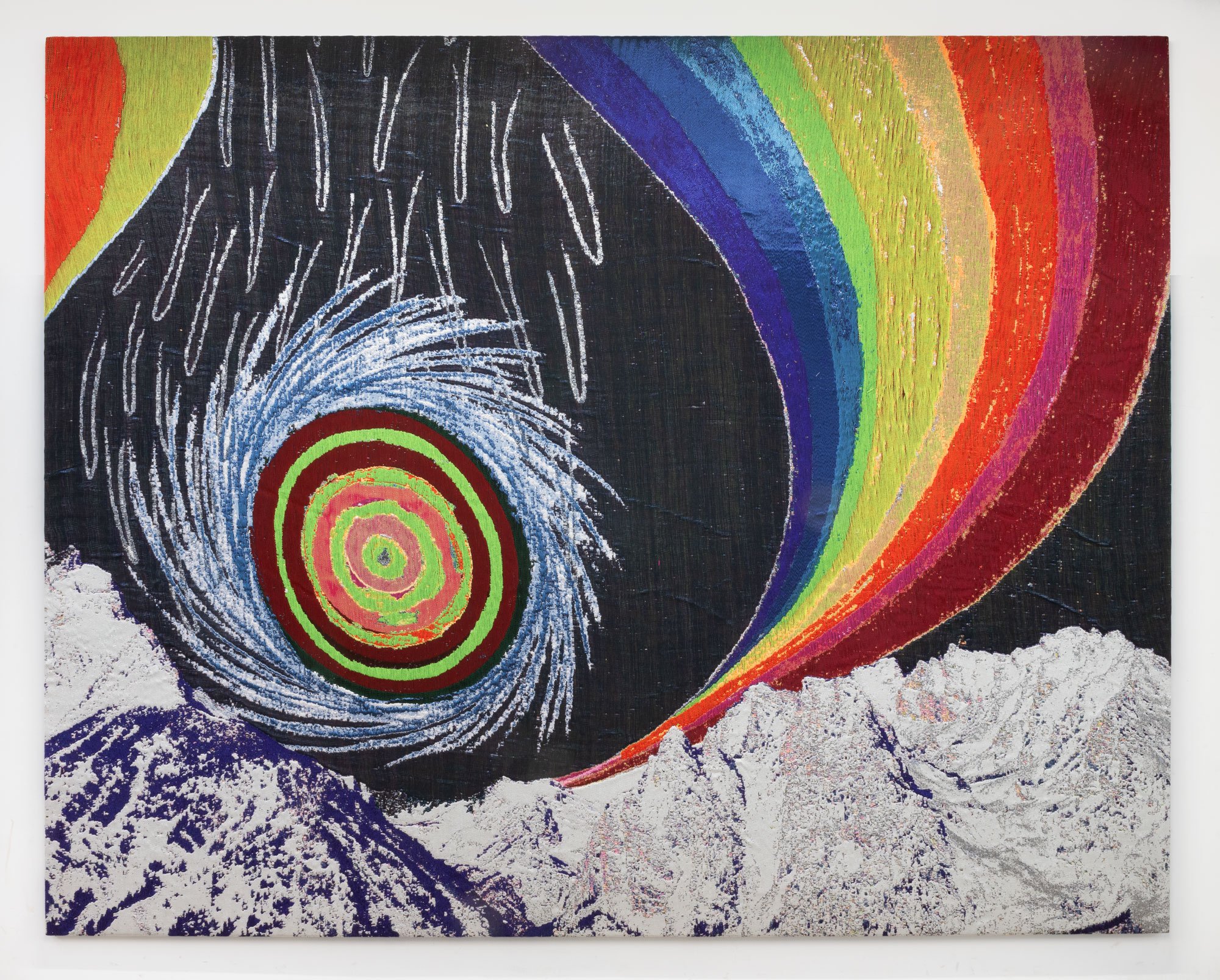 Central to the exhibition is a large-scale tapestry in which rainbows traverse sky and mountainscapes. The work is part of a series of woven landscapes entitled Rainbow Mountains that evoke the inner turmoil of an artist-activist in this contemporary moment–a consciousness at once hopeful, utopic, apocalyptic, and sublime. The exhibition’s title, Lightning Wheel, references one of several forms that reappear alongside lightning bolts, spheres, and cracked mirrors. Collins frequently crafts multiple iterations of her enigmatic compositions in different color combinations, materials, and fabrications in woven, embroidered, and embellished textiles, compounding and building her cosmology and iconographic vocabulary through repetition and the handmade.
