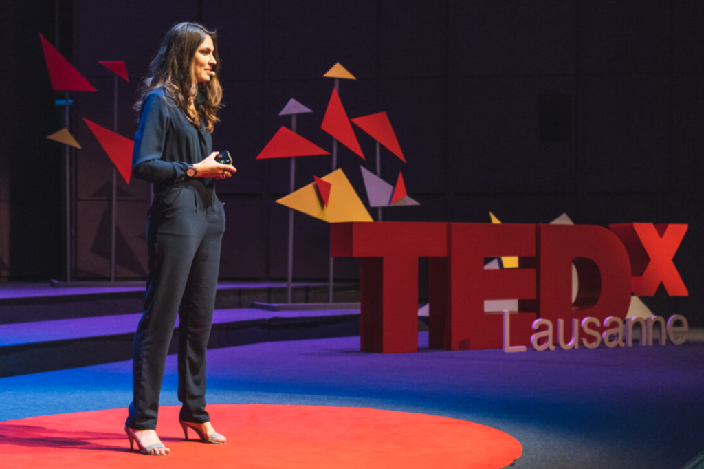 Marine Tanguy, courtesy of the speaker; Marine Tanguy giving a TED talk. Photo courtesy of TEDx.