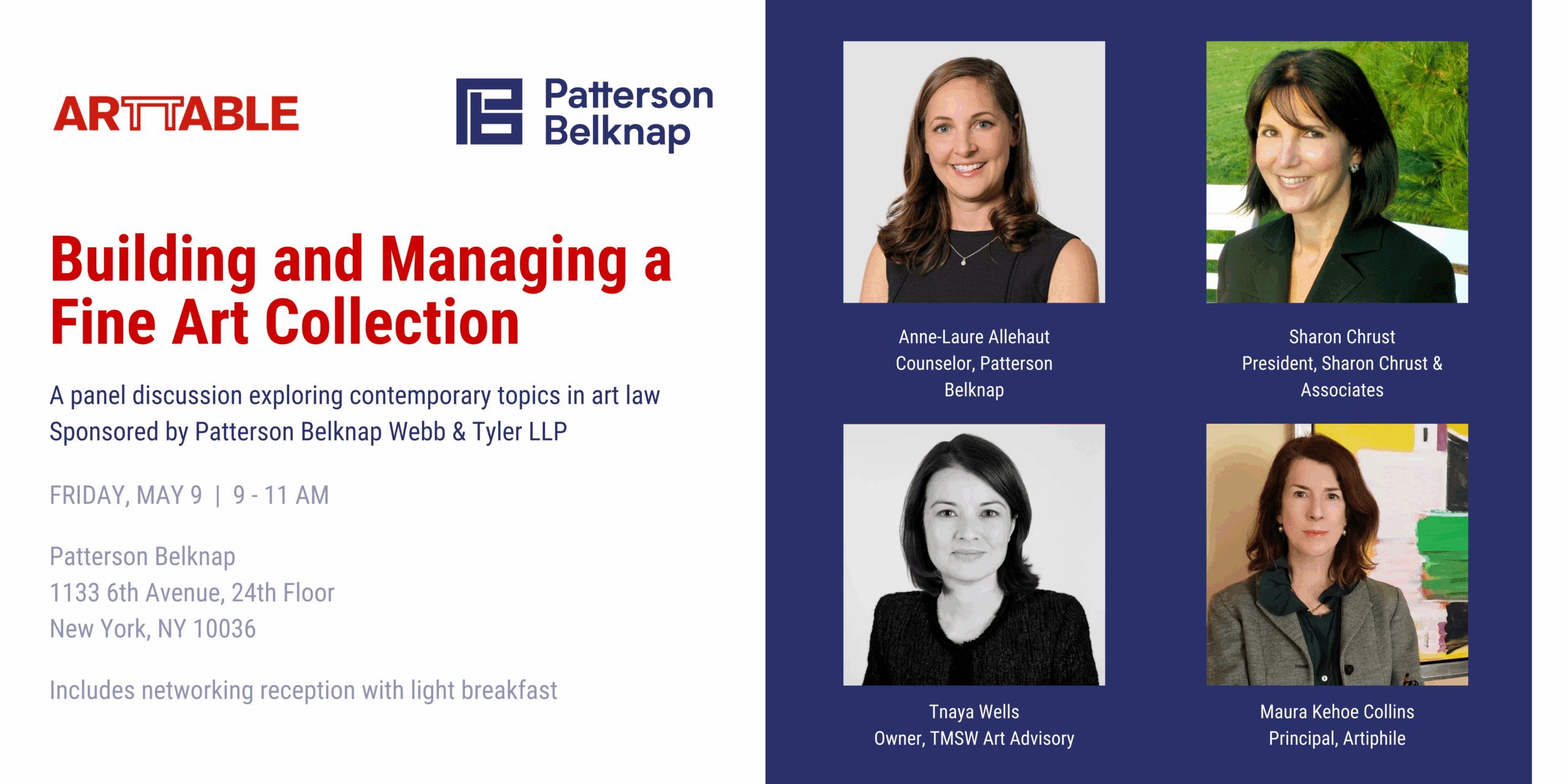 Join us for the third installment of ArtTable’s Art Law Series, produced in partnership with Patterson Belknap Webb & Tyler LLP. In this conversation, we will explore the various roles and responsibilities that are involved when building and managing an art collection. Coinciding with the Spring art fair season in New York, a city whose contemporary art scene is constantly evolving, this panel will focus on the professionals who help collectors navigate the collection- building and management process. What resources are available to guide collectors when purchasing artworks? How should a collector care for the art once it is in their collection? What are the responsibilities when owning fine art that new collectors might not be aware of? We will hear from several arts professionals involved at the different stages of collection-building, from the initial purchase to long-time care and conservation.